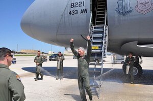 May 3, 2015 433rd AW Vice Commander completes fini-flight With clear blue skies and rays of sunshine, Col. Aaron G. Vangelisti, 433rd Airlift Wing vice commander, completed his final flight here on May 1.The colonel's last flight (fini flight) follows a tradition in which aircrew members, upon completion of their final flight with the wing, are met and