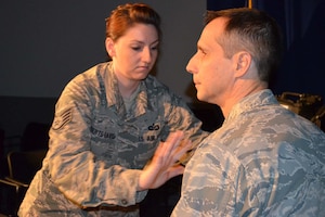 Feb. 6, 2013 Lights, Camera, Action Staff Sgt. Holly Roberts-Davis, 3rd Combat Camera Squadron, adjusts the microphone on Col. Jeffrey T. Pennington's, 433rd Airlift Wing commander, uniform prior to taping a message to 433rd AW personnel concerning the use of removeable media on government networks at the 3rd CCS television studio on