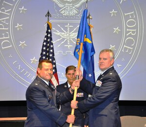 April 17, 2012 433rd Medical Squadron receives new commander Col. Anthony Pena, left, accepts the guidon and command of the 433rd Medical Squadron from Col. William Blanchette, 433rd Medical Group commander on April 14, 2012, during an assumption of command ceremony at the Kelly Annex on Joint Base San Antonio-Lackland, Texas. (U.S. Air Force photo/Maj. Tim
