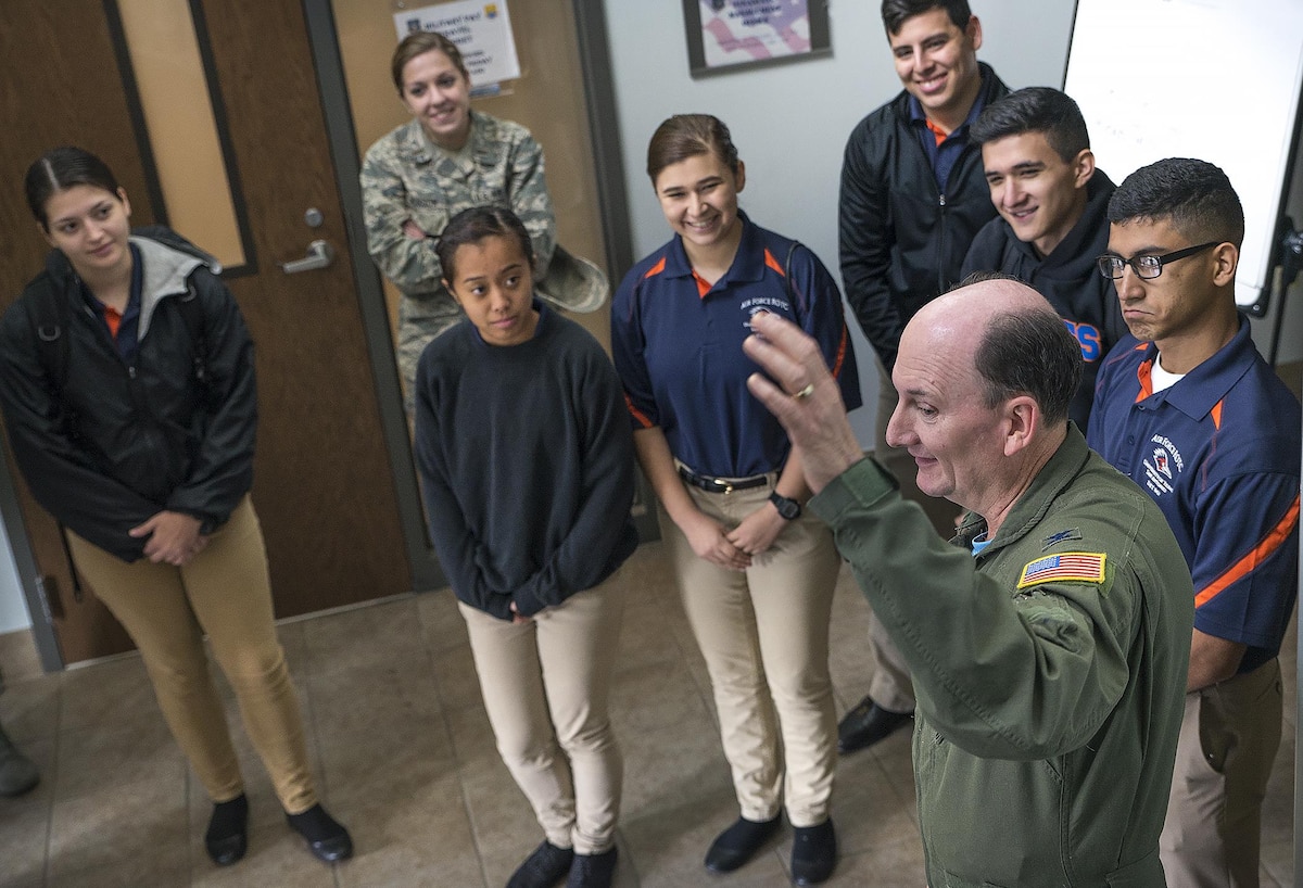 UTSA ROTC cadets visit Alamo Wing Published Oct. 31, 2017 433rd Airlift Wing Public Affairs JOINT BASE SAN ANTONIO-LACKLAND, Texas -- The Alamo Wing welcomed 14 University of Texas at San Antonio's Reserve Officers' Training Corp cadets Oct. 27, 2017 here. The cadets began their tour with a question and answer session given by Col. Thomas K. Smith, Jr., 433rd Airlift Wing commander, at the wing headquarters building. From there, the cadets visited the 433rd Training Squadron where they met Master Sgt. Brian Mizula, 733rd Training Squadron instructor flight engineer. Mizula gave the cadets a tour of the flight simulator before heading to the flight line for a C-5M Super Galaxy tour. "Touring the 433rd AW and C-5 aircraft gives our cadets another opportunity to see the different careers in the Air Force that await them before they commission," said Capt. Glen Peoples, Air Force ROTC Detachment 842 operations flight commander. "These cadets are going to be our future leaders of the Air Force." The C-5M tour allowed the cadets to get an up-close view of the largest aircraft in the Air Force. The cadets toured the cargo hold, troop compartment and flight deck before concluding their visit. "Its just mind blowing how large and how much weight this aircraft can haul," said Cristino Garcia, cadet fourth class. "This tour has broadened my horizons on what I want to do in the Air Force, I'm leaning towards being a pilot now".