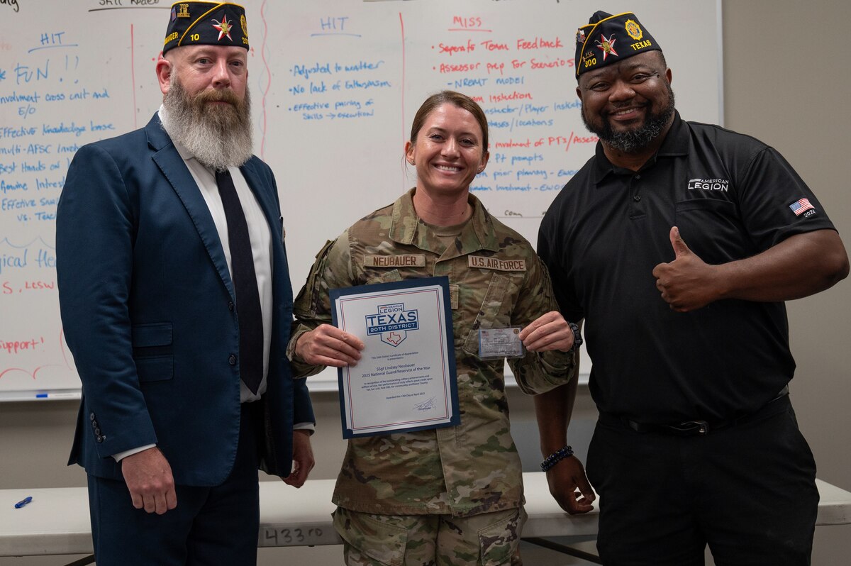 Staff Sgt. Lindsey Neubauer: The American Legion’s Spirit of Service Award Published Sept. 4, 2025 By Technical Sgt. Melissa Estevez 433rd Airlift Wing JOINT BASE SAN ANTONIO-LACKLAND, Texas -- Staff Sgt. Lindsey Neubauer, 433rd Aeromedical Staging Squadron, was presented the Spirit of Service Award by the American Legion, during the 433rd Medical Group’s commander’s call, Aug. 2, 2025. Representatives from multiple American Legion posts across Bexar County attended the ceremony to recognize Neubauer’s exceptional military service and volunteerism. In addition to the national honor, she was also awarded: -The American Legion Post 300 National Security, National Guard/Reservist of the Year -The American Legion District 20, Department of Texas, National Security, National Guard/Reservist of the Year -The American Legion Department of Texas National Security, National Guard/Reservist of the Year These accolades culminated in her selection for the American Legion National Spirit of Service Award for National Guard and Reserve members. Neubauer has been invited to attend the 106th National Convention of the American Legion in Tampa, Florida, where she will be recognized alongside six other honorees from other U.S. military branches. Staff Sgt. Lindsey Neubauer, 433rd Aeromedical Staging Squadron, was presented the Spirit of Service Award by the American Legion, during the 433rd Medical Group’s commander’s call, Aug. 2, 2025. Neubauer has been invited to attend the 106th National Convention of the American Legion in Tampa, Florida. Photo Details / Download Hi-Res A native of Keams Canyon, Arizona, and raised in Farmington, New Mexico, Neubauer comes from a long line of military service, stretching back to the Civil War. She enlisted in the Air Force Reserve in 2020 as an aerospace medical technician and has since taken on leadership roles in major training exercises, including Patriot Medic. Earlier this year, she took part in Lesser Antilles Medical Assistance Team (LAMAT 25), a global health engagement in the Caribbean. Outside of uniform, Neubauer has participated in dental missions with her church to Mexico and India, assisting more than 400 patients and helping raise $25,000 for the cause. Neubauer’s dedication to service, both military and humanitarian, earned her the American Legion’s highest recognition for National Guard and Reserve members.