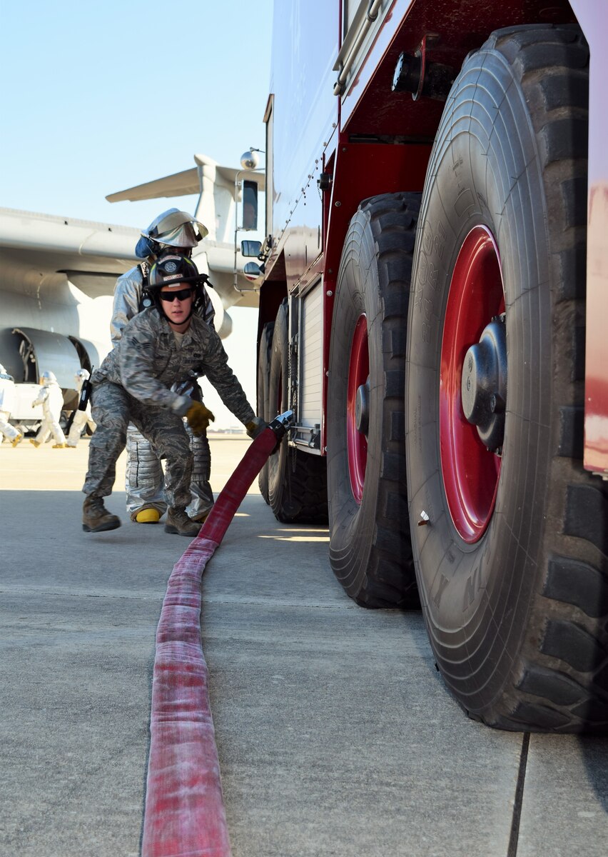 Firefighters to the rescue Published Dec. 8, 2015 By Tech. Sgt. Lindsey Maurice 433rd Airlift Wing Public Affairs JOINT BASE SAN ANTONIO-LACKLAND, Texas -- Firefighters with the 433rd Civil Engineer Squadron rushed to the flightline with lights flashing as they responded to multiple simulated C-5A engine fires here Dec. 6 as part of an annual training exercise. The firefighters are required to undergo C-5 egress training annually in order to remain proficient. During the training session, experts within the unit evaluated the firefighters on their response procedures, ability to extinguish the fires, conduct search and rescue and power down the aircraft.
